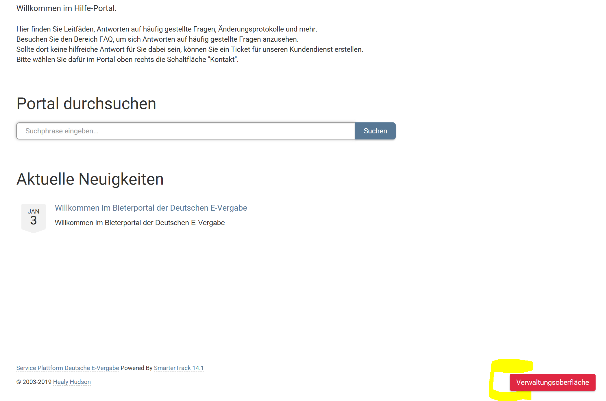 SmarterTrack includes the link to the Management Interface as part of the user menu at the top of the portal pages (see below). This menu option is automatically removed from the menu for users without any employee roles. The button shown in your screenshot was probably added using some of SmarterTrack's customization features, such as a custom Main Portal Announcement and Custom CSS Style Overrides. I would recommend checking your custom styles and announcements to see if that is where this button is coming from.