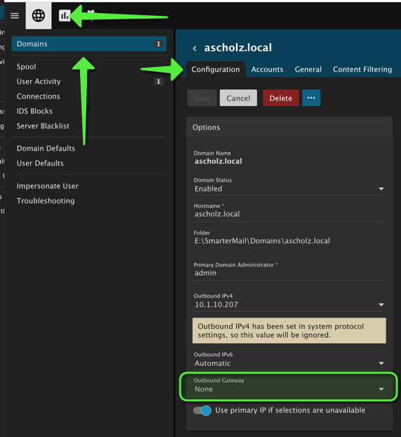 Here you can set the outbound gateway ( from a list of ones you have already created ).