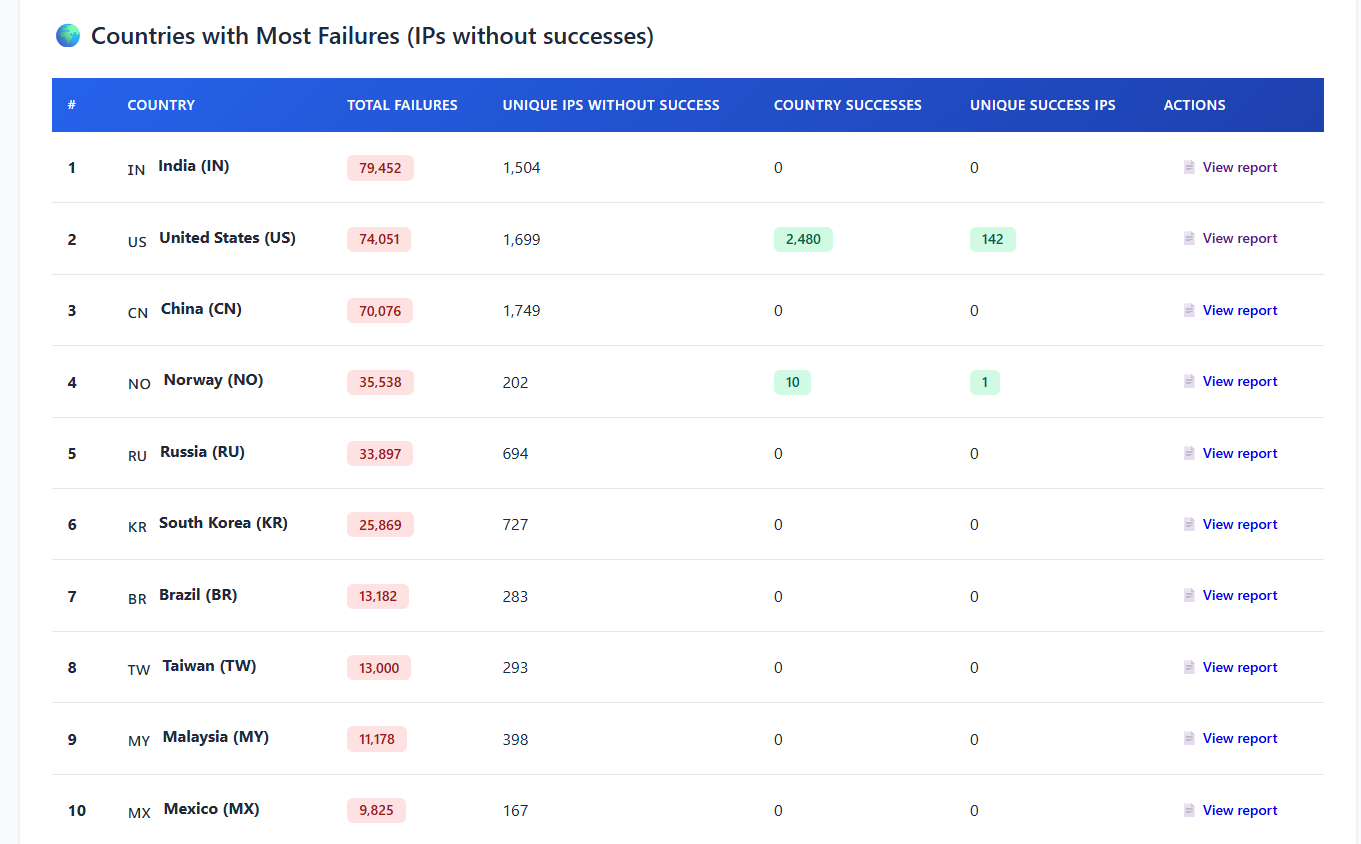 BTW, I am continually amazed at how many failed attempts come from China. And... why so many attempts at a user named "e9ginpfa-1klghsfw" from so many IPs? Any IP trying to log in with that user name should automatically be barred for life.