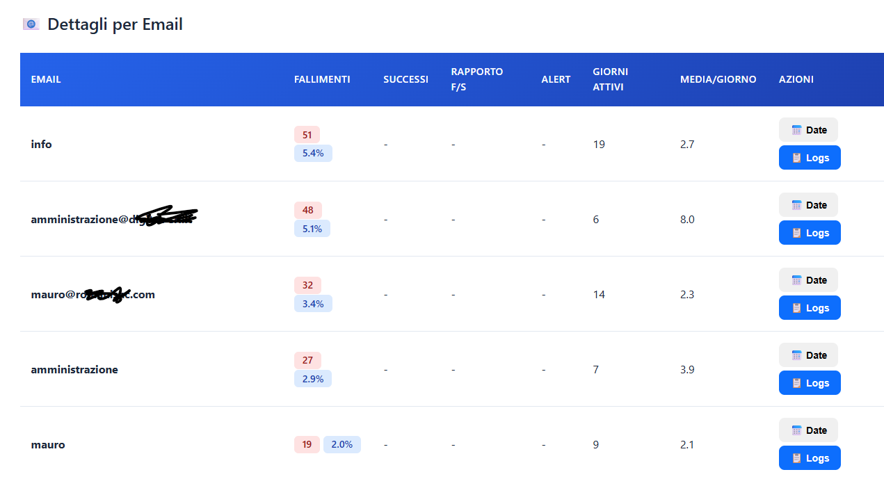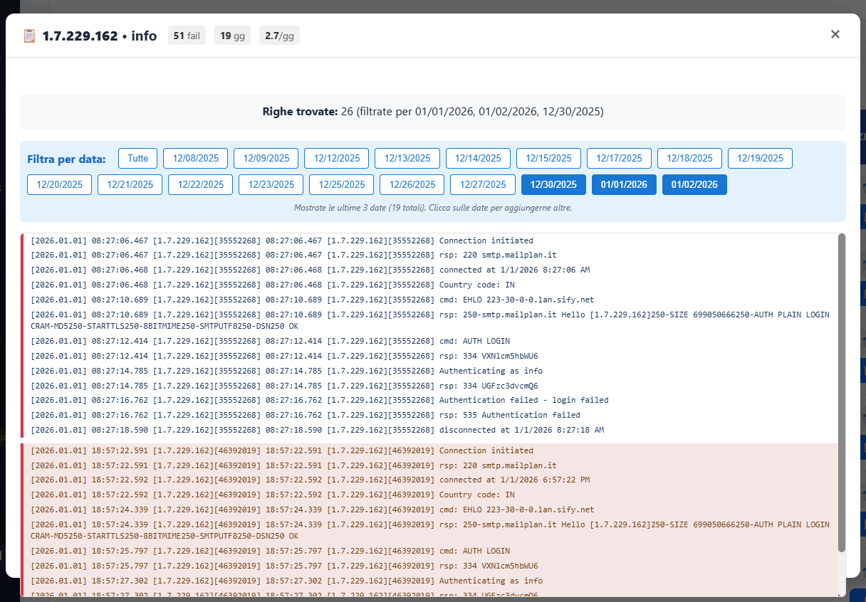 Total of 210 failed attempts, just from this one IP. You can average these fails around, say, twelve users x six domains per IP, often trying three times a day on each. Most of the time, it's more.