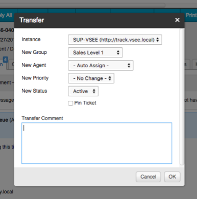 - In the Transfer window, select your new installation as the Instance, and then select the Group and Agent the ticket should be assigned to. As you’re simply transferring the ticket, you can also set the priority and status as well as add any comments, just as you do when transferring tickets between Departments and Groups. Please note that transferring tickets will default the status as Active, so if you are transferring waiting or closed tickets ensure the proper status is selected.
